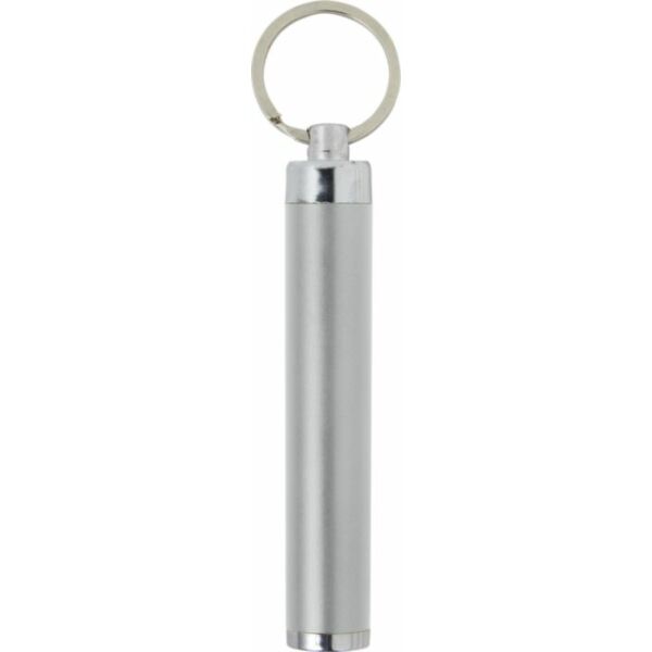 Kleine LED zaklamp met sleutelring. De glanzende behuizing is speciaal ontworpen voor laser gravering; de gravering licht op wanneer de zaklamp aan is. Inclusief drie knoopcel batterijen.