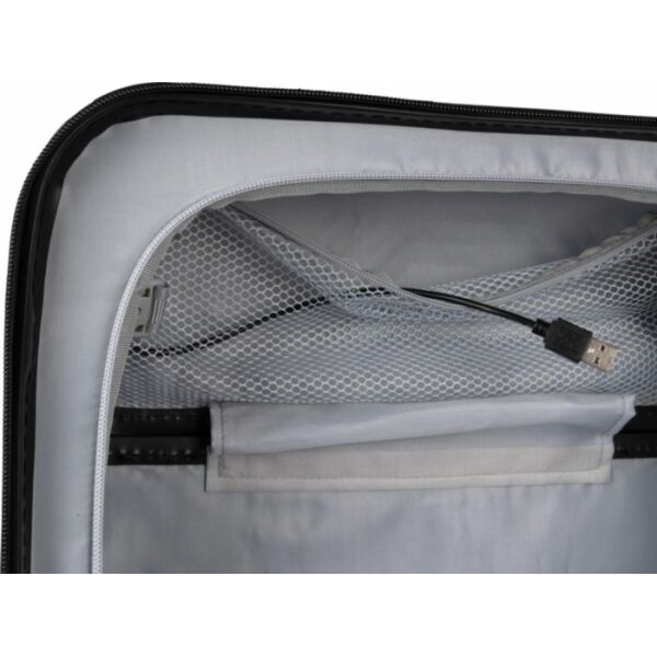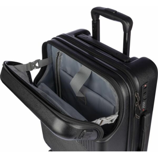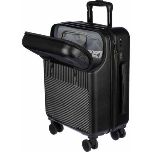ABS handbagagetrolley (20 inch) met voorvak met ritssluiting voor laptop, 8 wielen en een handvat met drie standen. Voorzien van cijferslot en apart plaatje voor lasergravure. Met USB-poort.