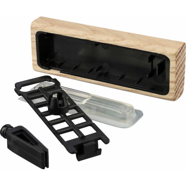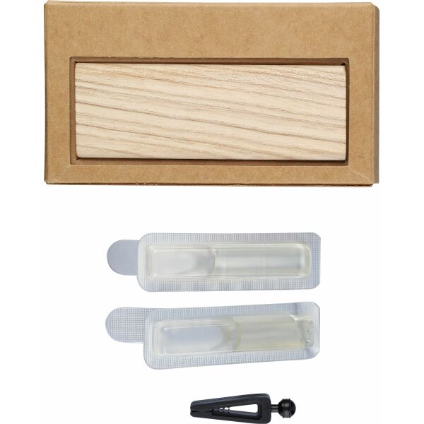 Beechwood autoverfrisser in natuurlijke kleur met in totaal 2 × 3 g sandelhoutgeur, alcoholvrij. Eén geurvulling is voorgeladen in de verfrisser, en één navulling wordt los meegeleverd in de doos. Voorzien van een ABS clip aan de achterzijde voor bevestiging aan het ventilatierooster in de auto. Individueel verpakt in een bruine kartonnen doos met illustratie.